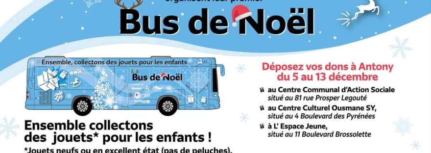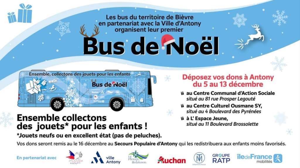 Les bus du territoire de Bièvre en partenariat avec la Ville d’Antony organisent leur premier Bus de Noël. Ensemble collectons des jouets pour les enfants ! Déposez vos dons à Antony du 5 au 13 décembre.