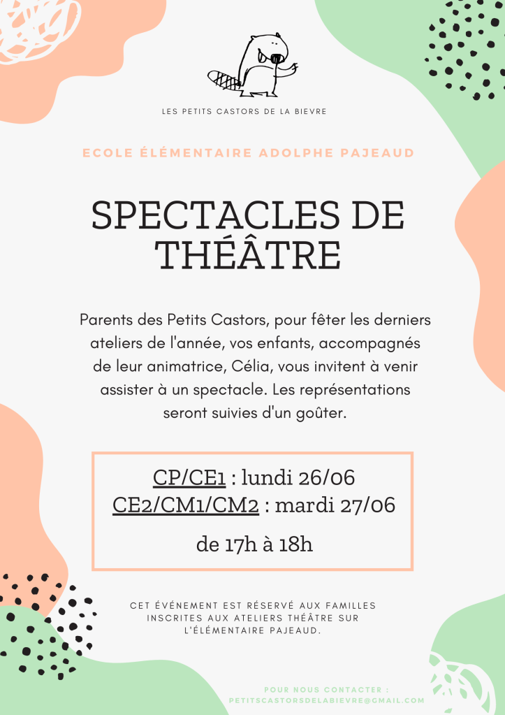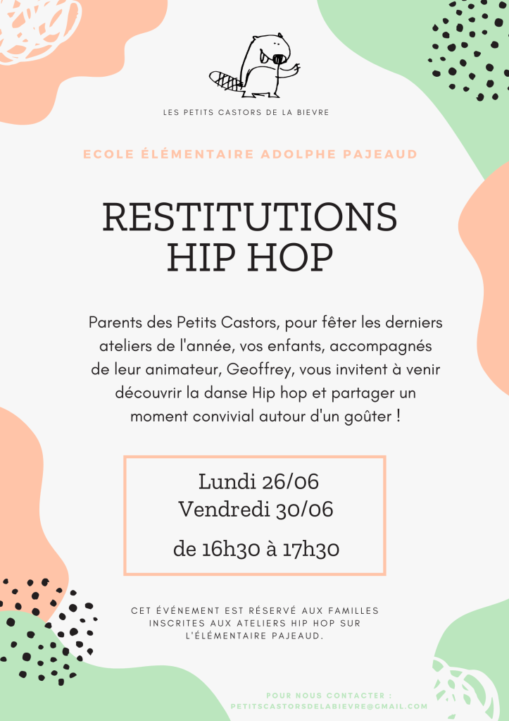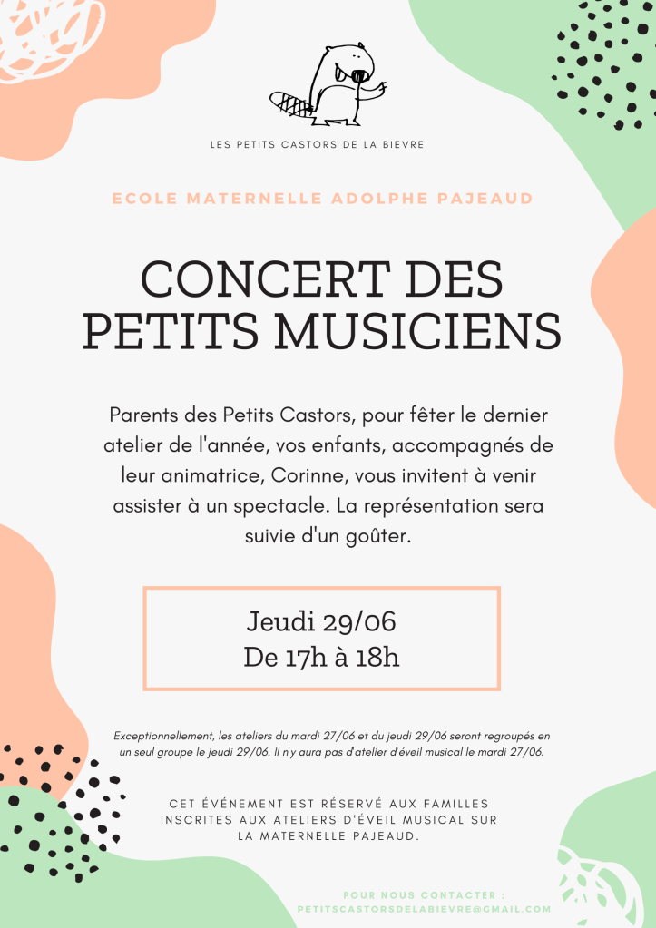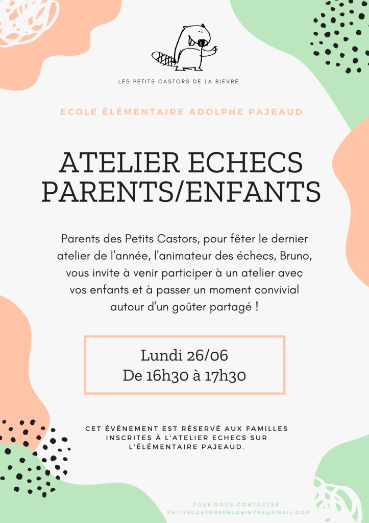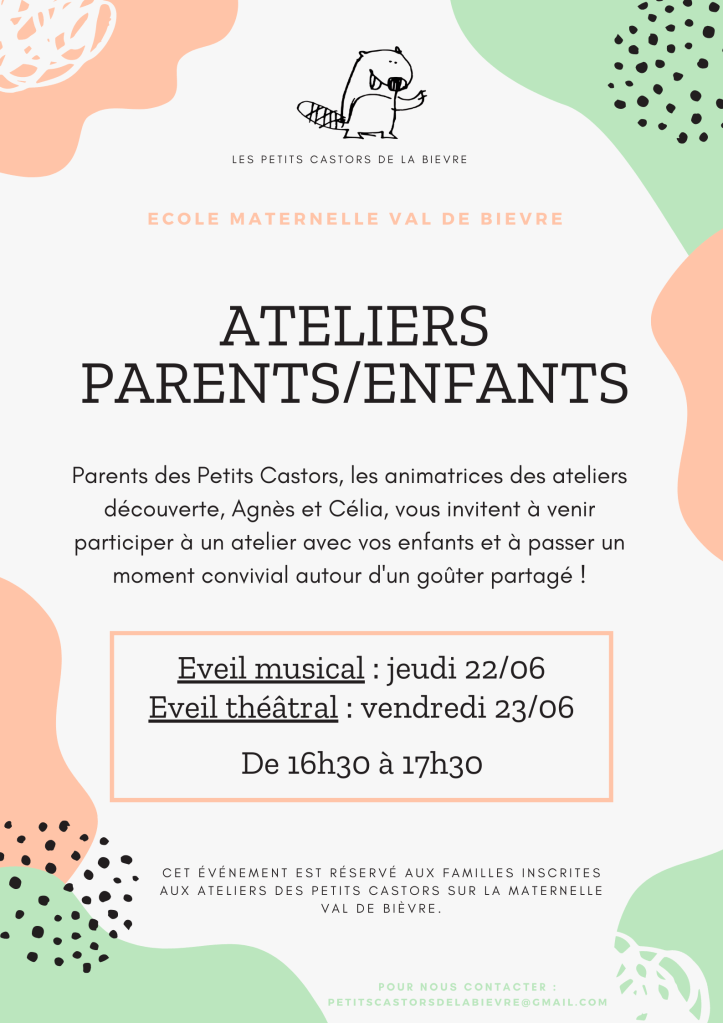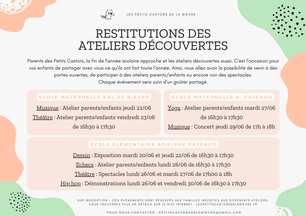La fin de l’année scolaire approche et les ateliers découvertes des Petits Castors aussi. C’est l’occasion pour les enfants de partager avec leurs parents ce qu’ils ont fait toute l’année. Ainsi, chers parents, vous allez avoir la possibilité de venir à des portes ouvertes, de participer à des ateliers parents/enfants ou encore voir des spectacles. Chaque événement sera suivi d’un goûter partagé pour lequel nous espérons la participation de chacun.