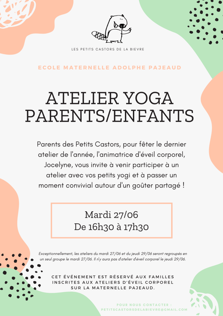 Les familles pourront accéder à l’atelier yoga à 16h30 (une fois les sorties de classes terminées) et au concert à 16h50. Merci de patienter au petit portail de la maternelle, sans passer par la garderie. Un bénévole sera présent pour vous orienter.