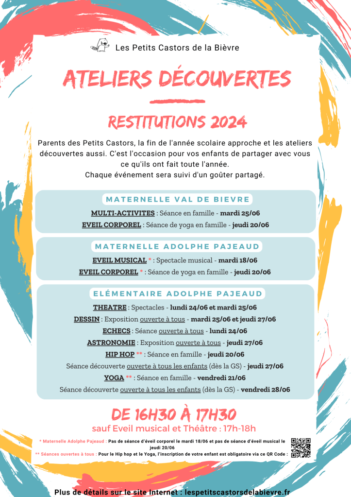 Voici le planning des restitutions des ateliers découvertes 2023/2024. Il reste sous réserve des autorisations municipales nécessaires.