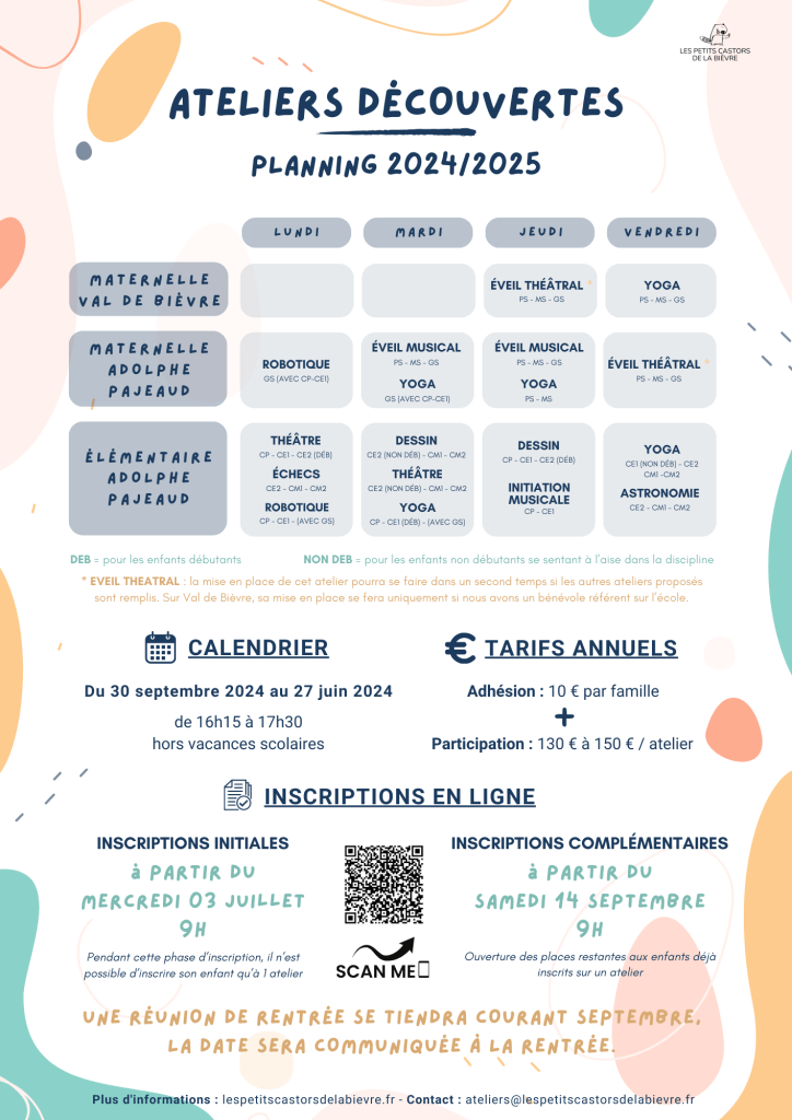 - Les ateliers débuteront avant les vacances de la Toussaint et non pas après ! Début des ateliers : lundi 30 septembre 2024.