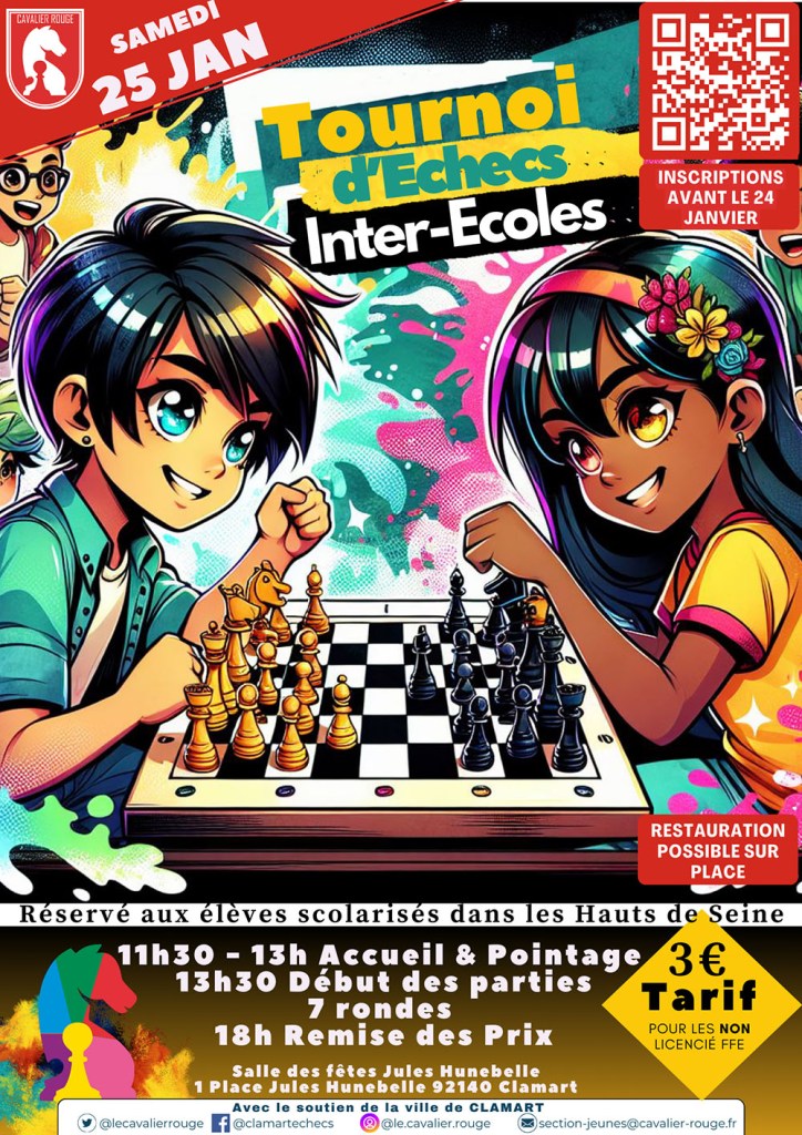 Il n’est pas nécessaire d’être licencié dans un club officiel d’échecs pour participer, donc n’hésitez pas ! Si vous souhaiter y participer, inscrivez vous via le lien ci-dessus et prévenez nous, des sessions d’entrainement pourront être mises en place avec notre animateur d’échecs et nous pourrons faire du covoiturage !