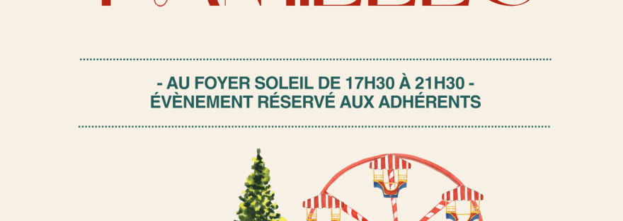 Rendez-vous au Foyer Soleil le 7 décembre 2024 de 17h30 à 21h30 environ ! Les enfants de tous les âges sont les bienvenus, accompagnés par au moins un adulte par famille. Apportez une préparation salée ou sucrée à partager (c'est mieux si elle est à thème !) et votre bonne humeur ! Inscriptions